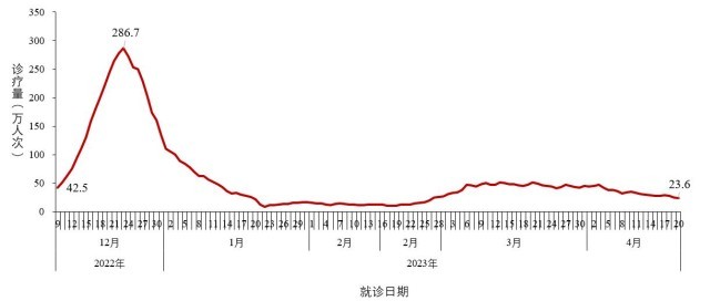 ?。ㄒ唬┛傮w就診人數結果。全國(不含港澳臺)發熱門診(診室)就診人數于2022年12月23日達到峰值286.7萬人次,隨后連續下降;2023年1月23日后就診人數呈現低位波動,約6周(2月24日-4月6日)的波動增加及平臺波動后,近2周(4月7日-4月20日)呈下降趨勢,4月20日為23.6萬人次,較峰值下降了91.8%(圖2-1)。