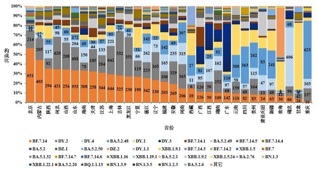 2.圖中標記的數字按順序分別為BF.7.14、DY.2、DY.4、BA.5.2.48、BA.5.2.49和DY.1進化分支有效基因組序列數量;
