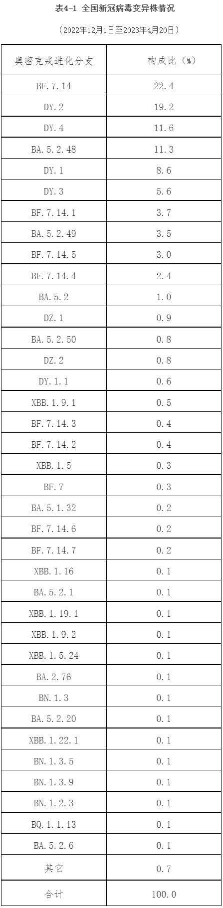 (二)12月以來本土病例病毒變異株監測情況。2022年12月1日至2023年4月20日,全國共報送32993例本土病例新冠病毒基因組有效序列,均為奧密克戎變異株,涵蓋117個進化分支。主要流行株為BA.5.2及其亞分支(構成比64.3%)和BF.7及其亞分支(構成比33.0%)等。其中,BA.5.2及其亞分支包括DY.2(19.2%)、DY.4(11.6%)、BA.5.2.48(11.3%)、DY.1(8.6%)、DY.3(5.6%)和BA.5.2.49(3.5%)等;BF.7及其亞分支包括BF.7.14(22.4%)、BF.7.14.1(3.7%)、BF.7.14.5(3.0%)、BF.7.14.4(2.4%)、BF.7.14.3(0.4%)和BF.7.14.2(0.3%)等(表4-1)。共監測到本土重點關注變異株603例,其中,4例BQ.1、4例BQ.1.1、19例BQ.1.1.13、1例BQ.1.1.17、1例BQ.1.1.18、1例BQ.1.1.35、1例BQ.1.1.38、1例BQ.1.1.46、1例BQ.1.1.53、2例BQ.1.1.66、1例BQ.1.1.69、8例BQ.1.2、1例BQ.1.23、2例BQ.1.8、2例CH.1.1、3例CH.1.1.1、1例CH.1.1.11、1例DT.2、1例EA.1、2例EG.1、3例EL.1、7例EM.1、1例EU.1.1、2例FB.1、3例FE.1、1例XBB、4例XBB.1、2例XBB.1.11.1、1例XBB.1.12、4例XBB.1.15、42例XBB.1.16、5例XBB.1.16.1、16例XBB.1.17.1、37例XBB.1.19.1、2例XBB.1.22、22例XBB.1.22.1、1例XBB.1.23、5例XBB.1.24、1例XBB.1.4、109例XBB.1.5、2例XBB.1.5.11、9例XBB.1.5.12、2例XBB.1.5.15、7例XBB.1.5.23、35例XBB.1.5.24、1例XBB.1.5.28、1例XBB.1.5.32、1例XBB.1.5.36、1例XBB.1.5.5、2例XBB.1.5.7、2例XBB.1.9、163例XBB.1.9.1、35例XBB.1.9.2、1例XBB.1.9.3、1例XBB.1.9.5、11例XBB.2.3、1例XBB.2.3.2、1例XBB.2.4和2例XBB.3。