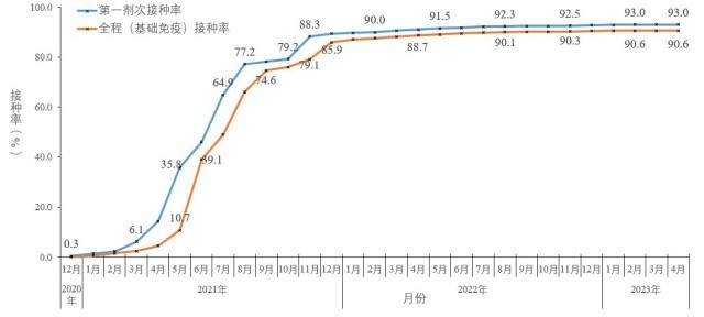 截至2023年4月20日,31個?。ㄗ灾螀^、直轄市)和新疆生產建設兵團累計報告接種新冠病毒疫苗349443.2萬劑次(圖5-1)。接種總人數131048.0萬人,完成全程接種127708.4萬人,完成第一劑次加強免疫接種82783.9萬人。全人群第一劑次、全程接種覆蓋比例分別達到93.0%和90.6%(圖5-2)。60歲以上老年人累計報告接種新冠病毒疫苗68083.7萬劑次,接種總人數24169.3萬人,完成全程接種23036.1萬人,完成第一劑次加強免疫接種19318.9萬人。