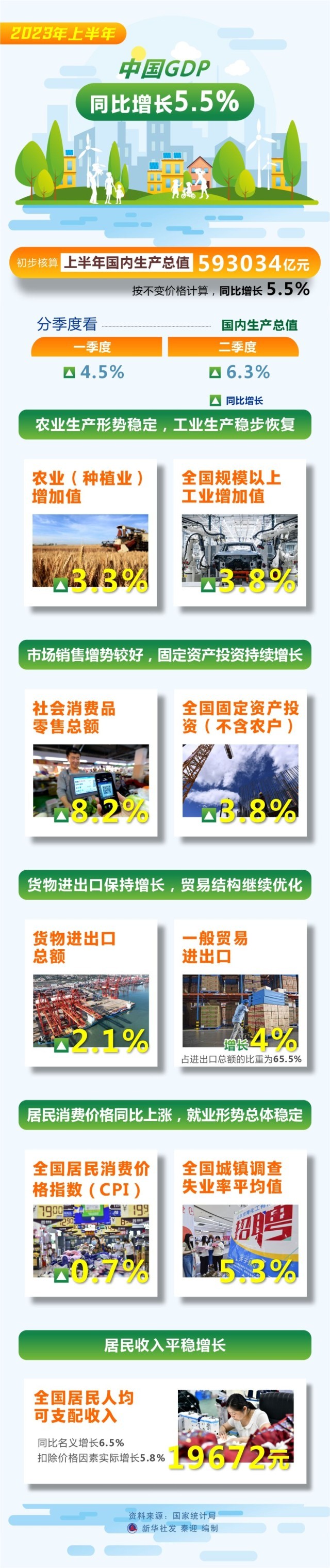 翻開半年報,國內生產總值比去年同期增長5.5%,社會消費品零售總額同比增長8.2%,第三產業(yè)增加值同比增長6.4%……多項指標顯示,我國經濟運行延續(xù)恢復向好態(tài)勢,同時物價、出口等部分指標增速放緩也引發(fā)關注。