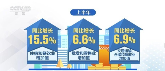 2023年上半年,我國服務(wù)業(yè)增加值同比增長6.4%,接觸型服務(wù)業(yè)較快增長。上半年,住宿和餐飲業(yè)、批發(fā)和零售業(yè)、交通運(yùn)輸、倉儲(chǔ)和郵政業(yè)增加值同比分別增長15.5%、6.6%和6.9%。