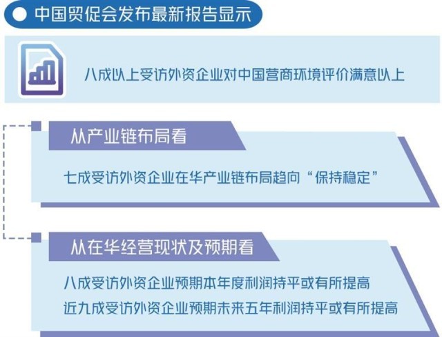 貿促會新聞發言人張鑫在當天舉行的例行新聞發布會上介紹該報告調研結果時指出,從產業鏈布局看,七成受訪外資企業在華產業鏈布局趨向“保持穩定”,這一比例較二季度環比提高4.57個百分點。從在華經營現狀及預期看,八成受訪外資企業預期本年度利潤持平或有所提高,近九成預期未來五年利潤持平或有所提高。從發展機遇看,受訪外資企業連續三個季度認為“技術創新與研發”是中國市場最大的發展機遇,約半數具有增資意愿的受訪外資企業考慮在西部地區增資。從發展期盼看,受訪外資企業普遍希望進一步“保證供應鏈、產業鏈穩定”“提高產業配套能力和集聚效應”“增強助企紓困政策的連續性、穩定性”。