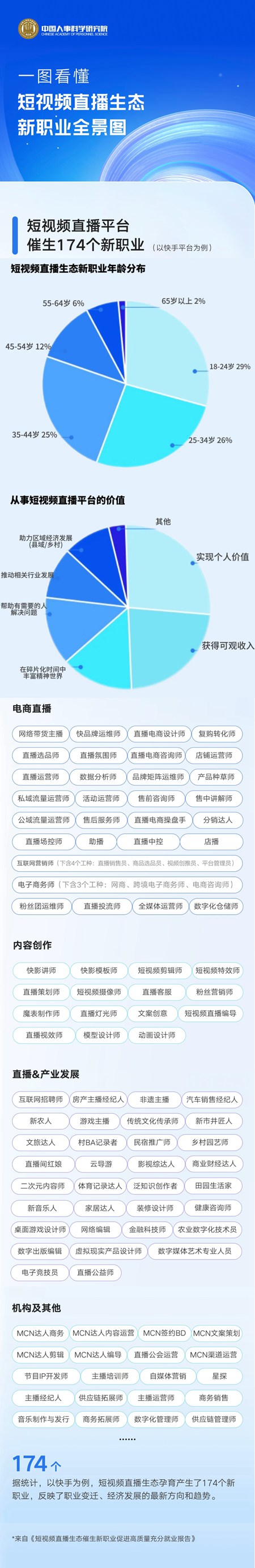 中國人事科學研究院近期發布的《短視頻直播生態催生新職業促進高質量充分就業報告》顯示,一塊屏幕背后發生了諸多變化:中青年成短視頻直播生態新職業的主力軍。其中,18-24歲占29%,25-34歲占26%,35-44歲占25%。18-34歲占比達到55%。《中華人民共和國職業分類大典(2022年版)》的1639個職業中,短視頻平臺快手覆蓋八成以上的數字職業,為勞動者提供了更廣闊的職業發展空間。