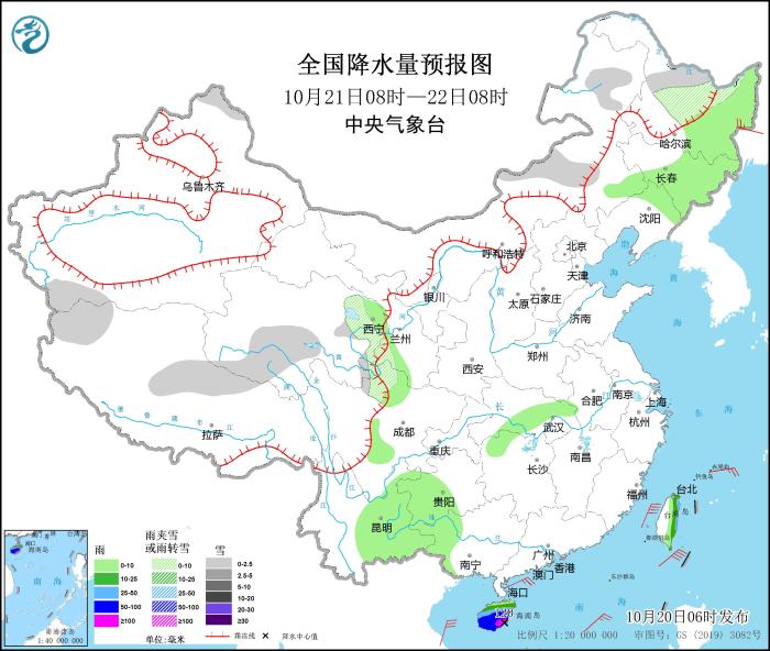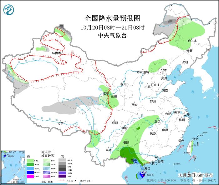 10月20日08時至21日08時,內蒙古東北部、新疆北疆北部和南疆西南部、西藏北部、青海東部和南部等地部分地區有小到中雪或雨夾雪,其中,新疆北疆北部等地部分地區有大到暴雪。廣西西部和南部、廣東西南部、海南島等地部分地區有中到大雨,其中,廣西南部沿海、海南島中東部等地部分地區有暴雨或大暴雨(100~150毫米)。