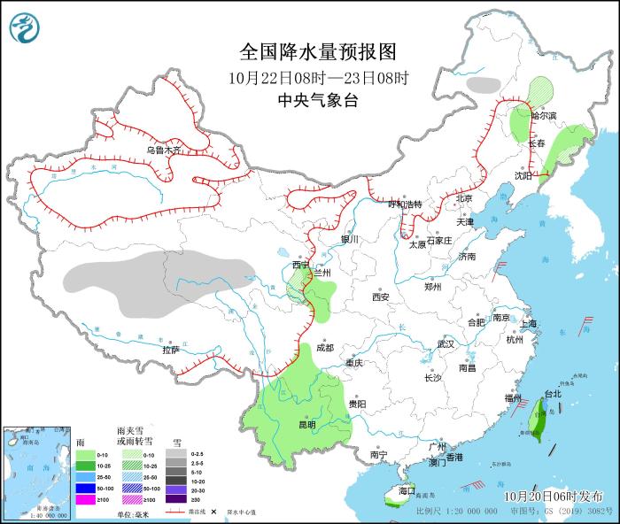 10月22日08時至23日08時,西藏北部、青海南部和東部等地部分地區有小雪或雨夾雪。西南地區南部、吉林東部、海南島南部、臺灣島等地部分地區有小到中雨,其中,臺灣島東北部等地部分地區有大雨。
