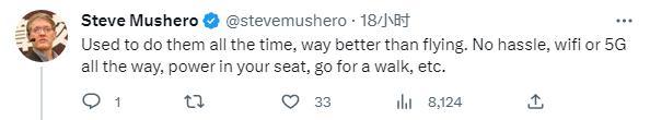 曾在中國工作多年的企業家Steve Mushero也留言說,“我以前一直坐高鐵,比坐飛機好多了。不麻煩,一直有wifi或5G,你的座位上有電源,還可以散散步等?!?/p>