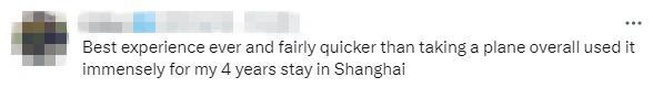 有網友介紹說,“最好的體驗,比坐飛機要快得多,我在上海呆了4年,坐過很多次?!?/p>