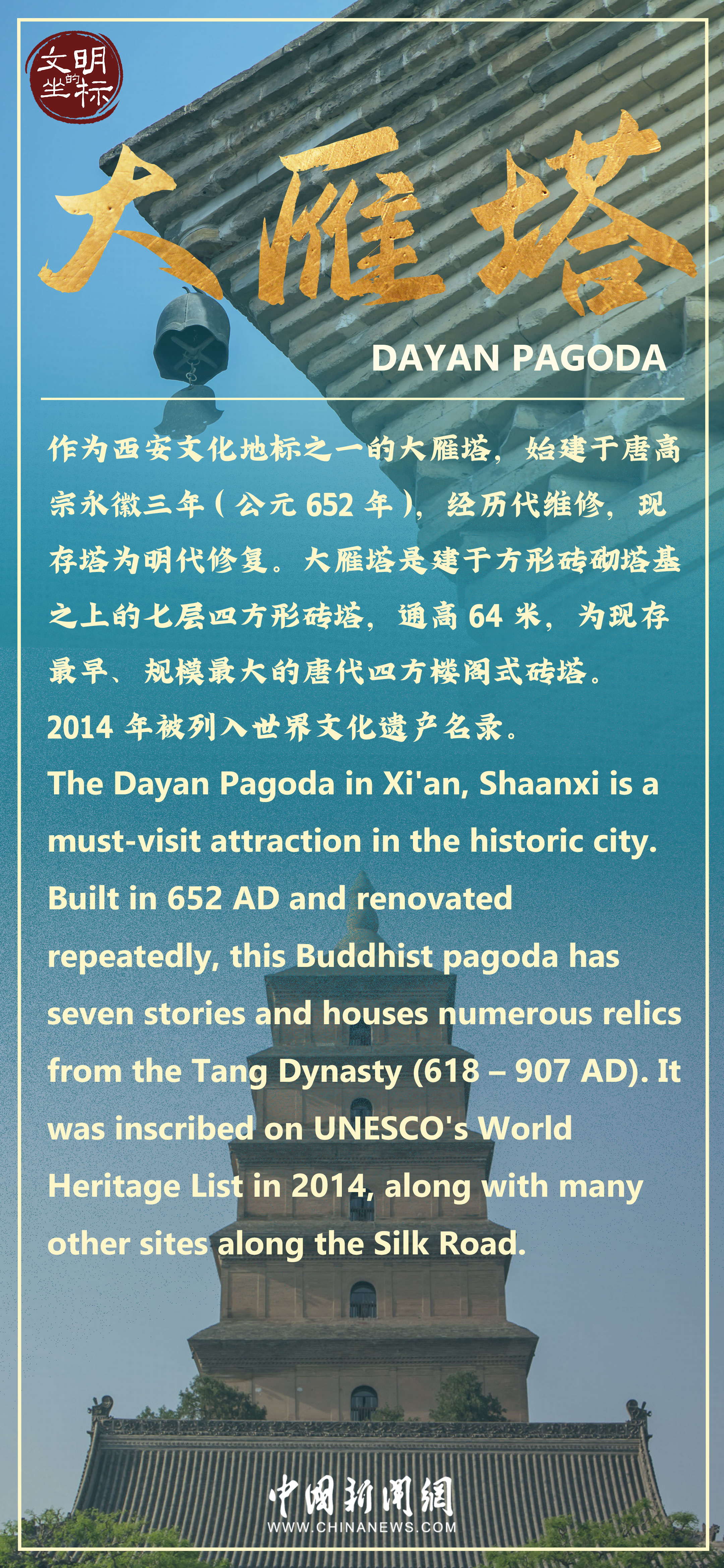 大雁塔又稱大慈恩寺塔,位于陜西省西安市雁塔區(qū),始建于唐高宗永徽三年(公元652年),為七層四方樓閣式磚塔。大雁塔現(xiàn)塔身通高64米,是為保存玄奘法師經(jīng)絲綢之路帶回長安的經(jīng)卷佛像而建,塔下碑文記述和佐證了大雁塔與絲綢之路佛教傳播的歷史。整個(gè)建筑氣魄宏大,莊嚴(yán)古樸,是唐代建筑藝術(shù)的杰作。走近大雁塔,感受“塔勢(shì)如涌出,孤高聳天宮”的氣勢(shì),觸摸“曲江流飲,雁塔題名”的歷史文脈。