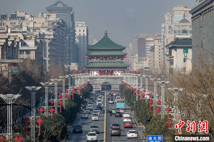 2023年1月7日,西安城墻永寧門,游覽城墻風光的游客絡繹不絕,熙熙攘攘。圖為從永寧門城墻上遠眺鐘樓。