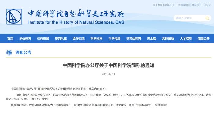 據(jù)中國科學院自然科學史研究所網(wǎng)站發(fā)布的消息,中國科學院辦公廳7月11日發(fā)布了關(guān)于中國科學院簡稱的相關(guān)通知,部分內(nèi)容如下:
