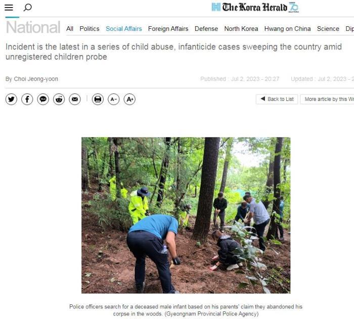 2023年7月2日,韓國(guó)慶尚南道警方稱(chēng),已向一名20多歲的男子和一名30多歲的女子發(fā)出逮捕令,原因是他們勒死了自己的孩子,并將尸體丟棄在慶尚南道巨濟(jì)附近的一條河里。