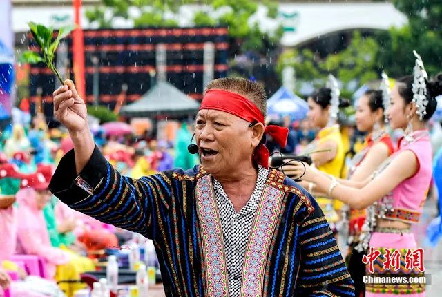 資料圖:黎族長老帶著“七仙女”向觀眾潑灑“圣水”送祝福。駱云飛 攝