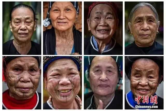 資料圖:黎族繡面文身承載著自母系氏族至今的歷史,是民族文化的“活化石”。圖為來自不同方言區的最后一代黎族繡面文身女子。駱云飛 攝