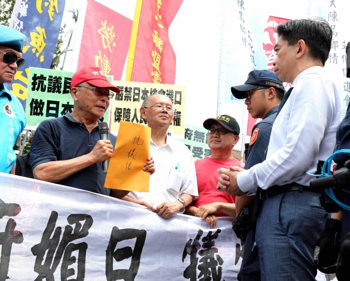 9月6日,臺灣數十個政黨和團體組成的反“臺獨”反介入聯合行動在臺北集會,抗議日本將核污染水排入海洋,要求民進黨當局嚴禁從日本核污染地區進口食物。圖為臺灣勞動黨主席吳榮元(左二)向民進黨當局食品安全辦公室官員(右一)遞交抗議信。