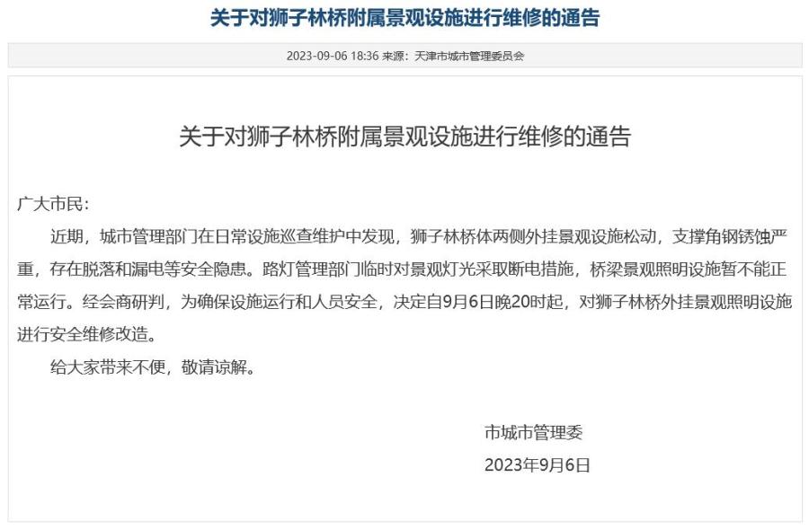 中新網9月7日電 6日,天津市城市管理委員會發出通告,對獅子林橋附屬景觀設施進行維修。天津市城市管理委表示,近期,城市管理部門在日常設施巡查維護中發現,獅子林橋體兩側外掛景觀設施松動,支撐角鋼銹蝕嚴重,存在脫落和漏電等安全隱患。路燈管理部門臨時對景觀燈光采取斷電措施,橋梁景觀照明設施暫不能正常運行。經會商研判,為確保設施運行和人員安全,決定自9月6日晚20時起,對獅子林橋外掛景觀照明設施進行安全維修改造。