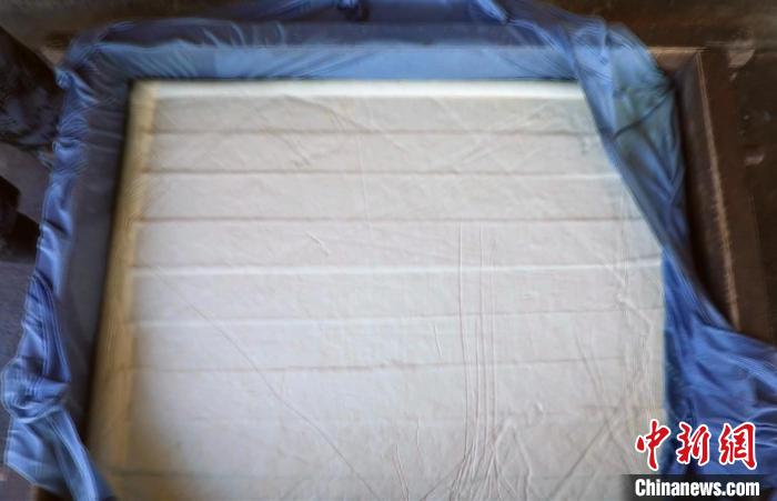豆?jié){與石膏相遇,化學(xué)反應(yīng)后,豆香味縈繞在鼻尖,香氣彌漫在空氣中。這時(shí),王志勇蓋上空隙均勻的木頭壓板,壓上石墩子,讓豆腐腦中的水分通過(guò)籠布和蓋板上的洞流走,等待豆腐壓好成型。