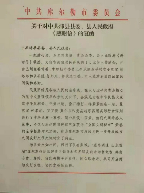 沛縣縣委、縣政府獲悉此事后十分重視,1月2日,以沛縣縣委、縣政府的名義,給新疆維吾爾自治區庫爾勒市委、市政府發去了一封感謝信,并從沛縣“好人基金”中拿出1萬元獎金,請庫爾勒市委、市政府轉交給曼蘇爾·帕塔爾和買買提·努爾東兩人,以獎勵二人的善行之舉,這才有了本文開頭庫爾勒市給沛縣回應“感謝信”復函那一幕。