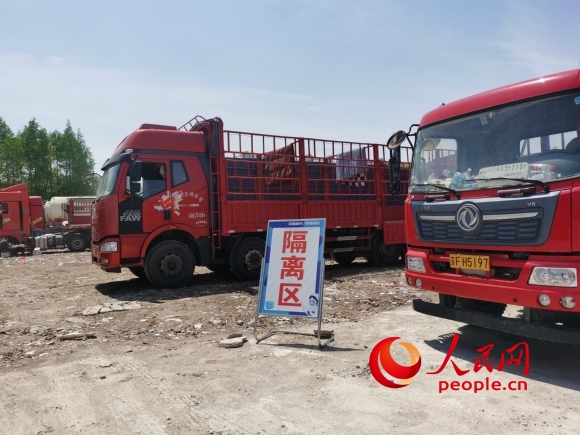 南通市崇川區(qū)陳橋街道疫情防控外來貨車集中停車點。人民網(wǎng)記者 王繼亮攝