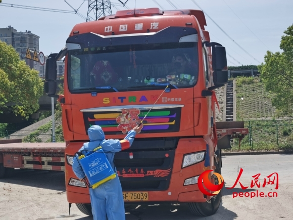 疫情防控人員對外來貨車進行消殺。人民網(wǎng)記者 王繼亮攝