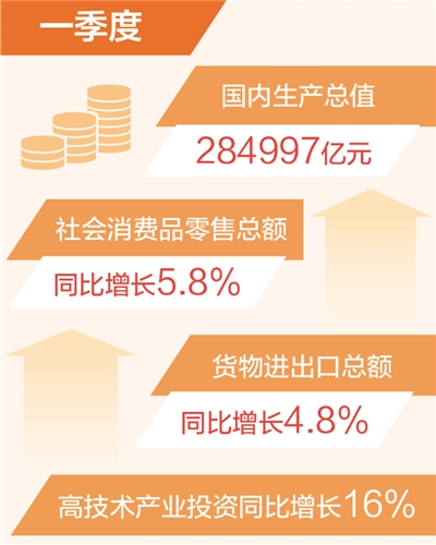 國內需求逐步擴大。一季度,社會消費品零售總額同比增長5.8%,服務零售額保持兩位數增長。一季度,固定資產投資同比增長5.1%,與上年全年持平。