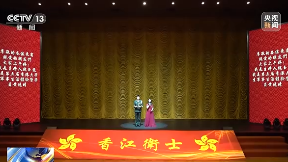 《香江衛(wèi)士》主題文藝演出舞臺上,身著紅色禮服的香港女孩黃逸晴與駐軍官兵同臺主持。黃逸晴是2015年香港大學生軍事生活體驗營的學員,大學畢業(yè)后,她經(jīng)常從事社會公益工作,把愛國精神、奉獻情懷傳遞給更多人。