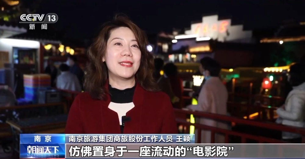 南京旅游集團商旅股份工作人員 王穎:每艘游船上都裝有GPS定位系統,再配合沿岸的燈光、投影,讓游船在行駛途中仿佛置身于一座流動“電影院”,完整地貫通、復刻“十里秦淮”的歷史景象。