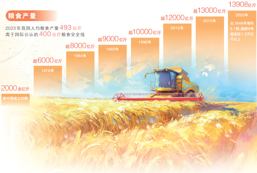豐收成色十足。“藏糧于地、藏糧于技”戰(zhàn)略深入實(shí)施,我國(guó)糧食綜合生產(chǎn)能力穩(wěn)步提升,連續(xù)9年穩(wěn)定在1.3萬(wàn)億斤以上。截至2023年,全國(guó)綠色、有機(jī)、名特優(yōu)新和地理標(biāo)志農(nóng)產(chǎn)品認(rèn)證登記總數(shù)達(dá)到7.5萬(wàn)個(gè)。蔬菜水果品種琳瑯滿目,居民的“菜籃子”“果盤子”更加豐富。
