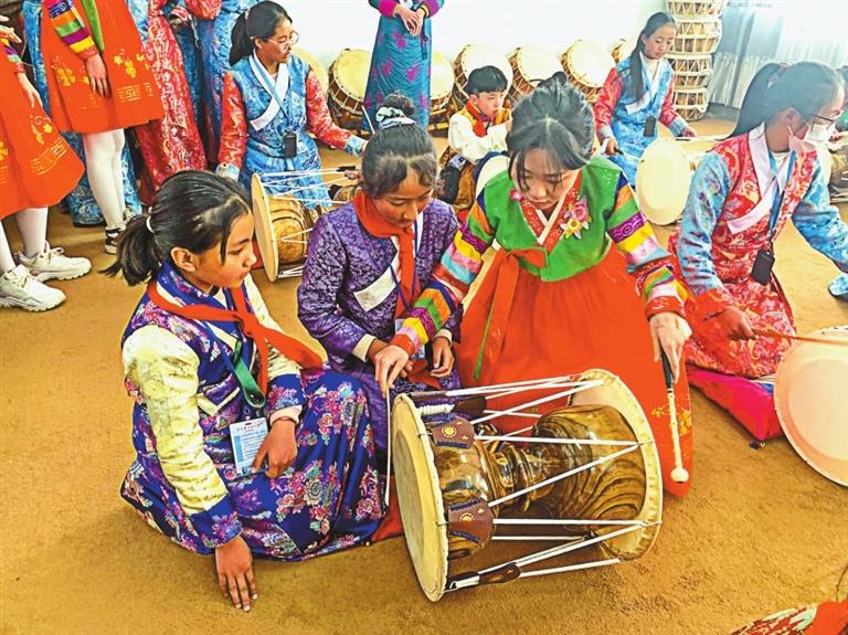 在“吉藏一家親”冬令營活動中,日喀則學生在朝鮮族學生指導下學習打朝鮮族長鼓。