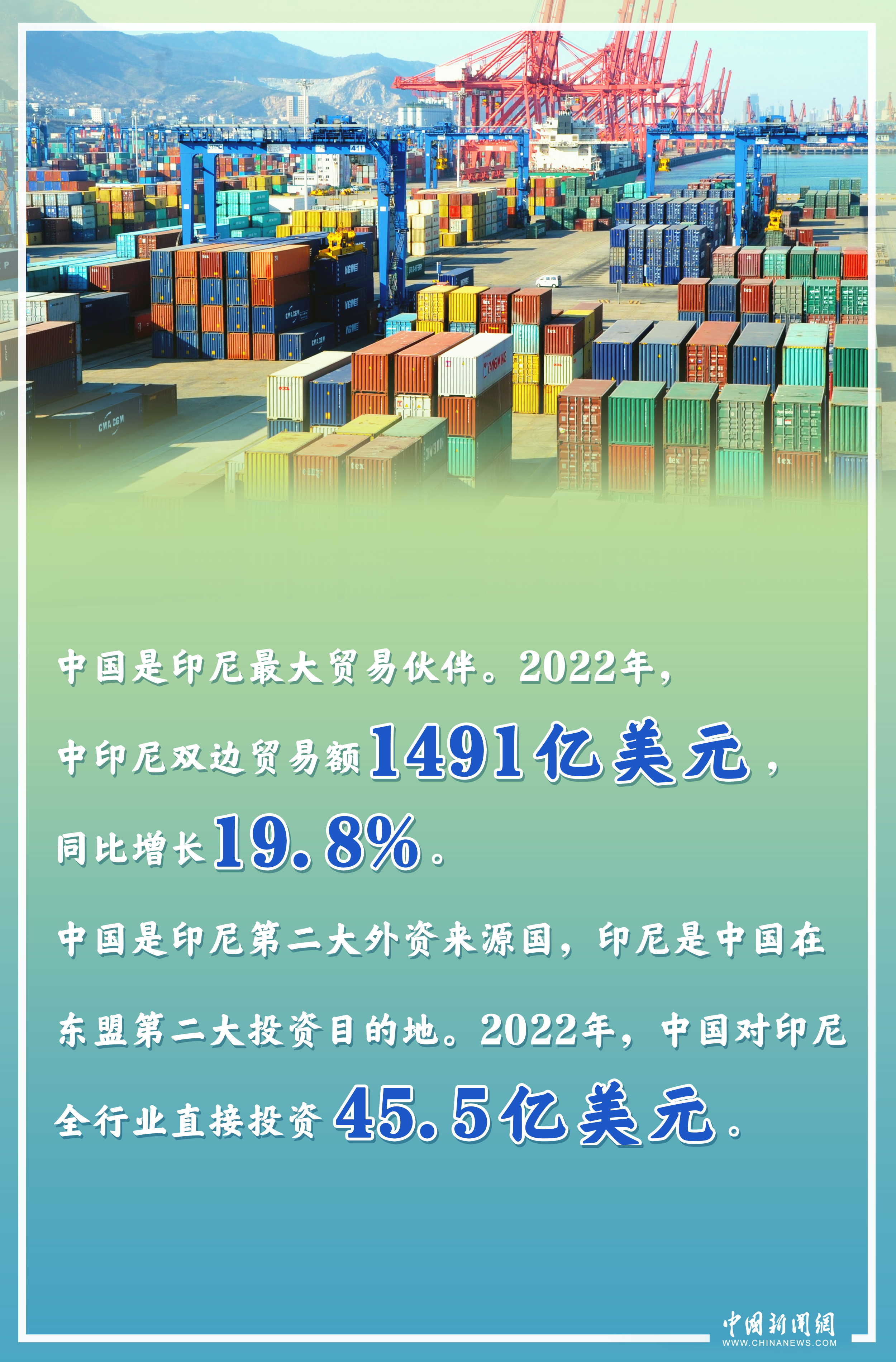 中國是印尼最大貿易伙伴。2022年,中印尼雙邊貿易額1491億美元,同比增長19.8%。中國也是印尼第二大外資來源國,印尼是中國在東盟第二大投資目的地。2022年,中國對印尼全行業直接投資45.5億美元。