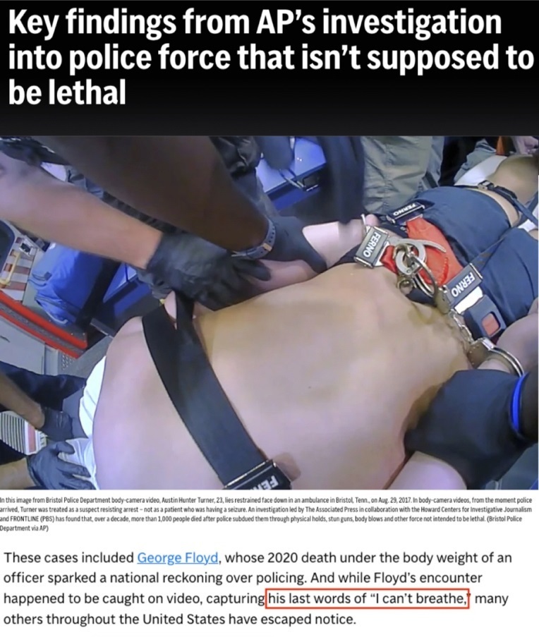 美聯社不久前主導的一項調查發現,在2012年至2021年的十年間,美國警察使用身體約束、電擊、毆打等所謂“非致命性手段”導致至少1036人死亡,平均每周兩人。