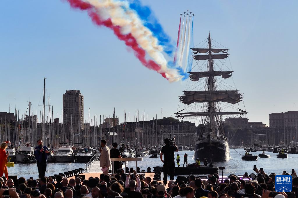 ??傍晚時分,伴隨著現場觀眾高唱法國國歌《馬賽曲》,“貝勒姆”號緩緩駛進港口,著名的“法蘭西巡邏兵”飛行表演隊從港口上空呼嘯而過,先后展示了奧運五環與法國國旗的圖案。