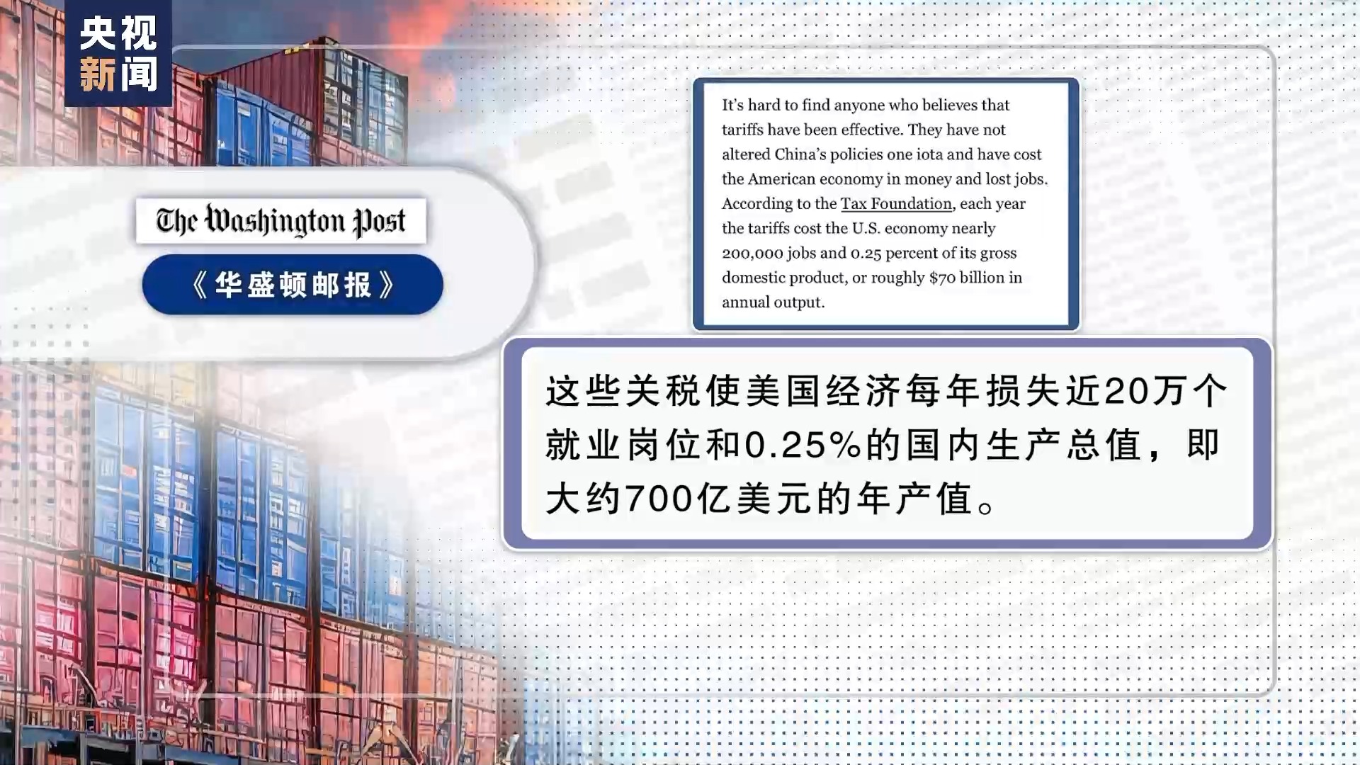 另據美國《華盛頓郵報》4月援引美國稅務基金會的數據,這些關稅使美國經濟每年損失近20萬個就業崗位和0.25%的國內生產總值,即大約700億美元的年產值。