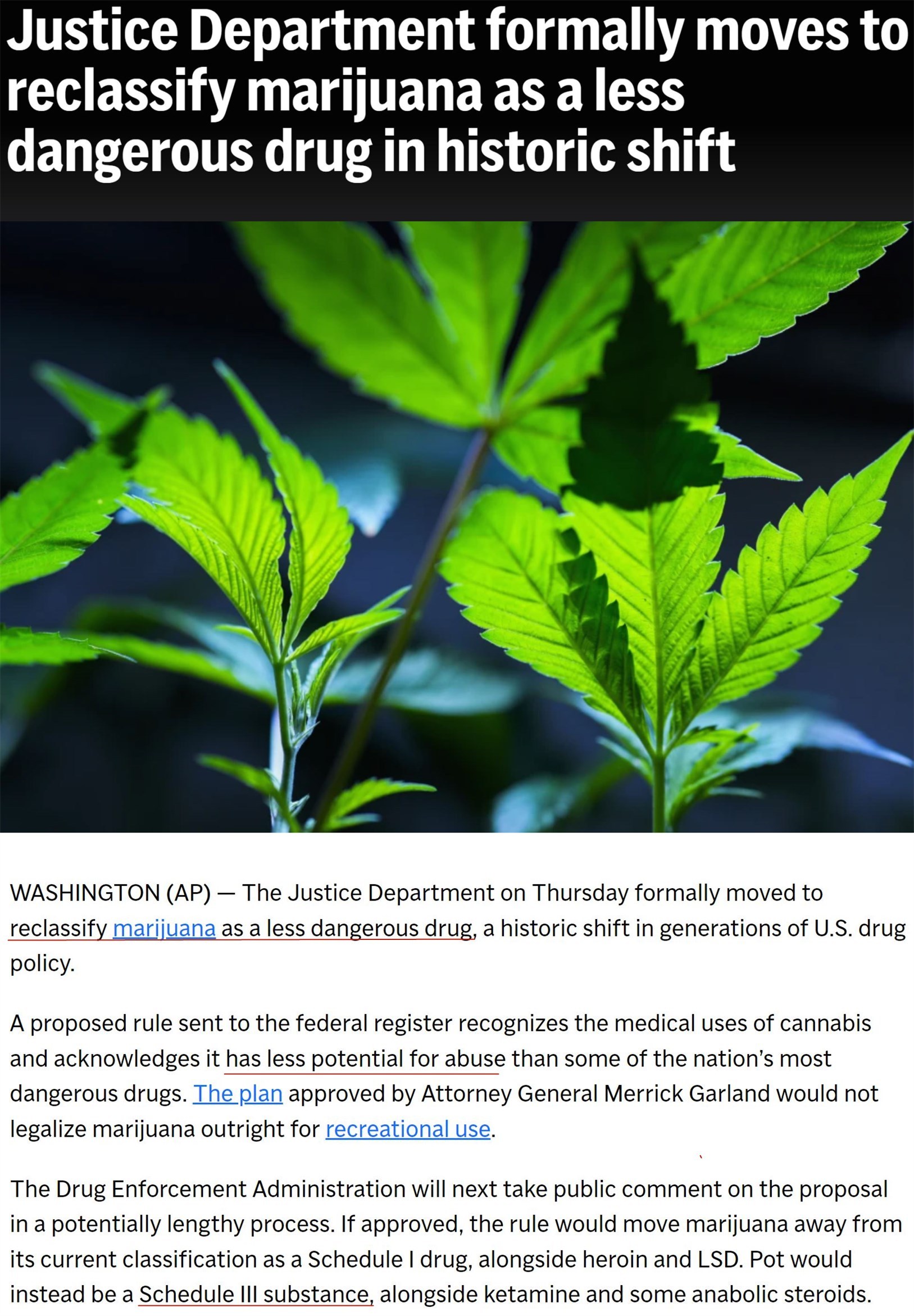 如果經過60天的公眾意見征詢期后最終獲批,新規則雖然不會在聯邦層面將大麻完全合法化,但會將其移出《美國聯邦管制物質法案》中列管海洛因等最危險毒品的“附表一”,轉而歸入列管氯胺酮和類固醇等危險性較低藥物的“附表三”。