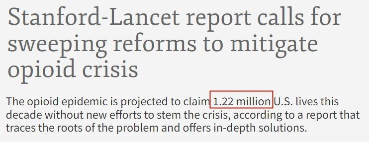 根據美國斯坦福大學和英國《柳葉刀》雜志共同進行的一項研究,如果美國不采取遏制措施,本世紀20年代將有約122萬美國人死于過量使用阿片類藥物,位列世界第一。