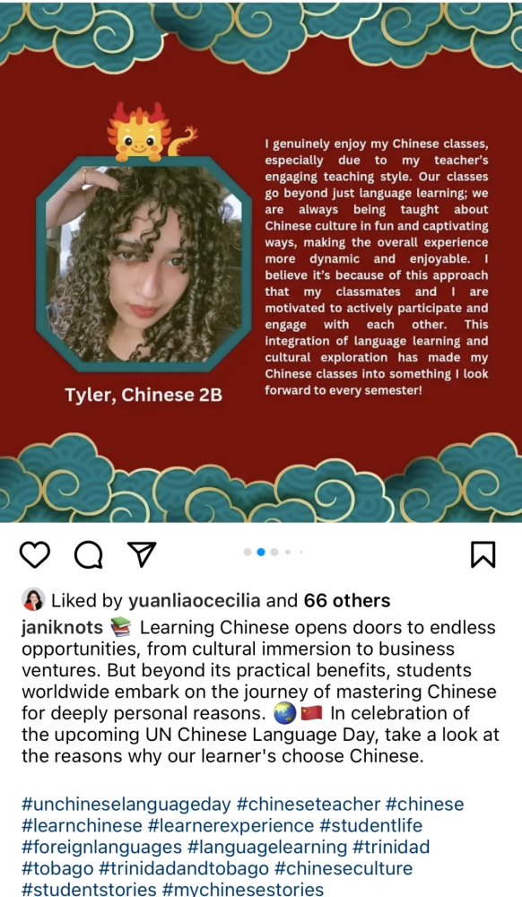 第十五個聯合國中文日和第五個“國際中文日”舉辦期間,中外語言交流合作中心與中國日報網聯合發起 “國際中文日”系列線上活動,鼓勵大家講述、分享與中文相遇的精彩故事,半個月內活動參與者覆蓋全球五大洲近70個國家和地區,包括英國、意大利、澳大利亞、美國、巴西、日本、韓國、泰國、老撾、迪拜、喀麥隆等,作品超2000件,閱讀量超1000萬,在中國和其他國家主流社交媒體平臺掀起“中文日”熱潮,吸引了海內外網友的廣泛關注。