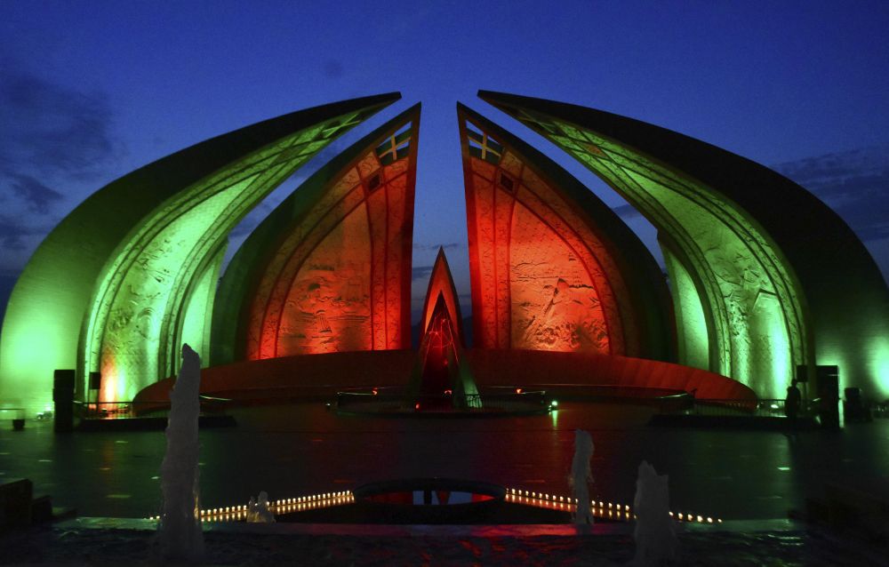 2023年7月29日,巴基斯坦首都伊斯蘭堡的巴基斯坦紀念碑亮起中巴兩國國旗顏色的燈光,慶祝中巴經濟走廊啟動十周年。新華社發