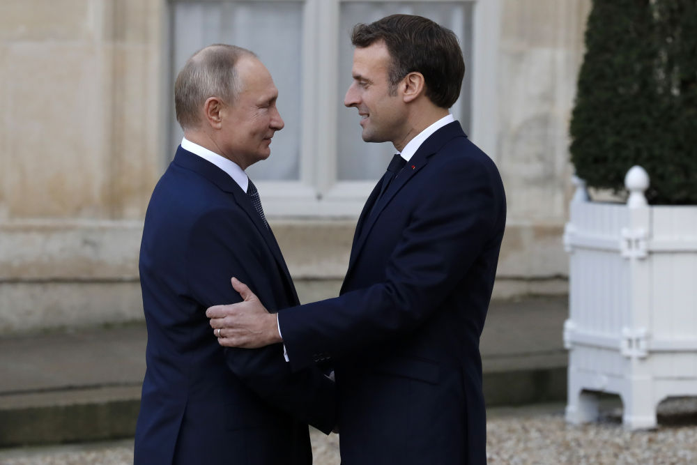 2019年12月9日,在法國巴黎,法國總統(tǒng)馬克龍(右)迎接前來參加“諾曼底模式”四國峰會(huì)的俄羅斯總統(tǒng)普京。新華社發(fā)(杰克·陳攝)