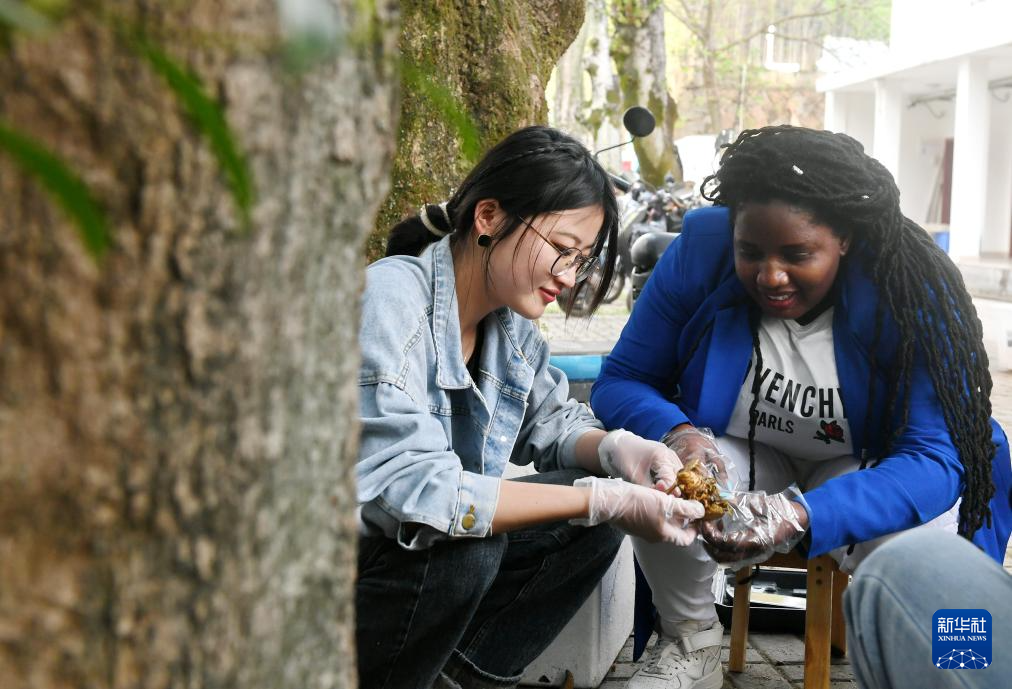 2024年3月28日,在位于福州的福建農林大學,來自盧旺達的梅迪在國家菌草工程技術研究中心向中國學生嘉欣瑤了解“綠洲3號”菌草品種。新華社記者 林善傳 攝