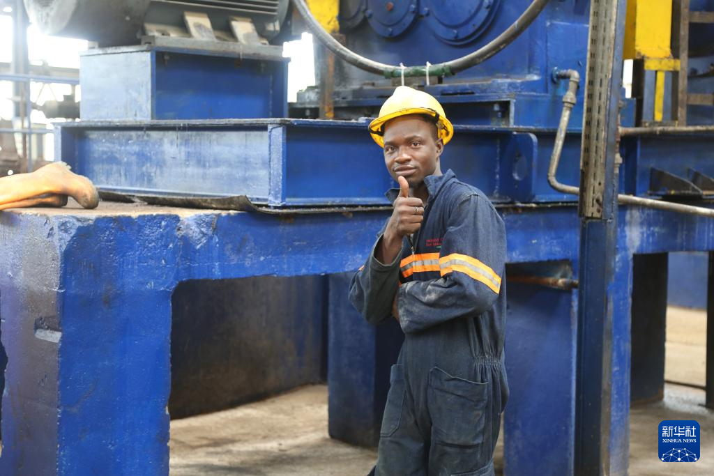 2024年6月10日,在科特迪瓦南部城鎮達布郊區,美蘭橡膠加工廠工人在機器旁豎起大拇指。新華社記者 張健 攝