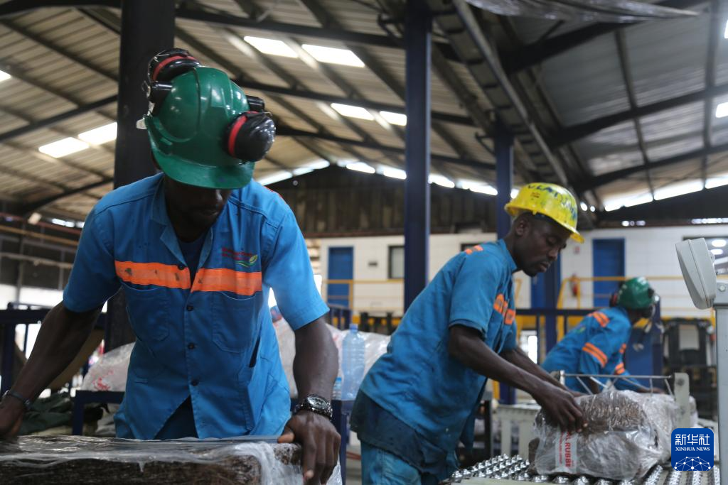 2024年6月10日,在科特迪瓦南部城鎮達布郊區,工人們在美蘭橡膠加工廠對成品橡膠進行打包。新華社記者 張健 攝