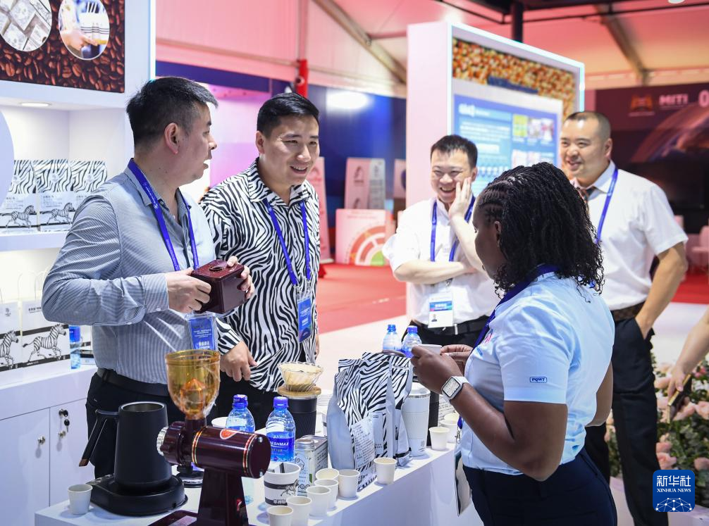 2024年5月9日,參展商在肯尼亞首都內羅畢舉辦的中非經貿博覽會走進非洲巡展上推銷咖啡產品。新華社記者 李亞輝 攝