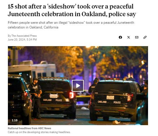 據報道,奧克蘭警方表示,槍擊事件發生在該市舉行的一場未經批準的六月節慶祝活動期間。有人踩上一輛汽車引擎蓋引發斗毆,進而發生槍擊事件。