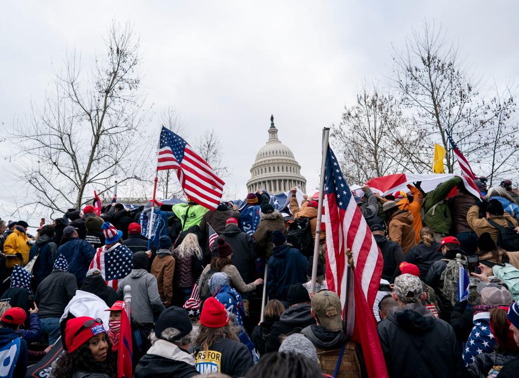 2021年1月6日,在美國首都華盛頓,時任總統特朗普的支持者在國會外舉行示威游行,部分示威者沖進國會大廈,與警方發生沖突,造成一人死亡,當時正在舉行的認證大選結果的國會參眾兩院聯席會議也被迫中斷。新華社記者劉杰攝