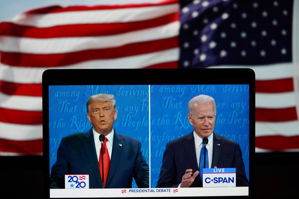 2020年10月22日在美國弗吉尼亞州阿靈頓拍攝的視頻畫面顯示,時任美國總統特朗普(右)與時任民主黨總統候選人拜登(左)在田納西州納什維爾市參加最后一場總統候選人電視辯論。新華社記者劉杰攝