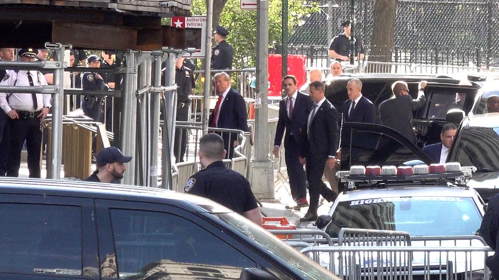 這張4月15日的視頻截圖顯示,美國前總統特朗普抵達紐約曼哈頓一家刑事法院出庭。新華社記者 丁曄 攝