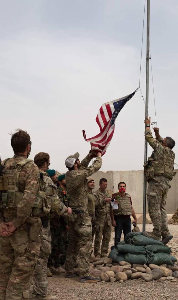2021年5月2日,美軍士兵在阿富汗赫爾曼德省一處軍事基地降下美國國旗。當(dāng)日,美軍向阿富汗國民軍移交這處軍事基地。美國和北約軍隊5月1日起正式開始撤離阿富汗,計劃在9月11日前撤完。新華社發(fā)(阿富汗國防部供圖)