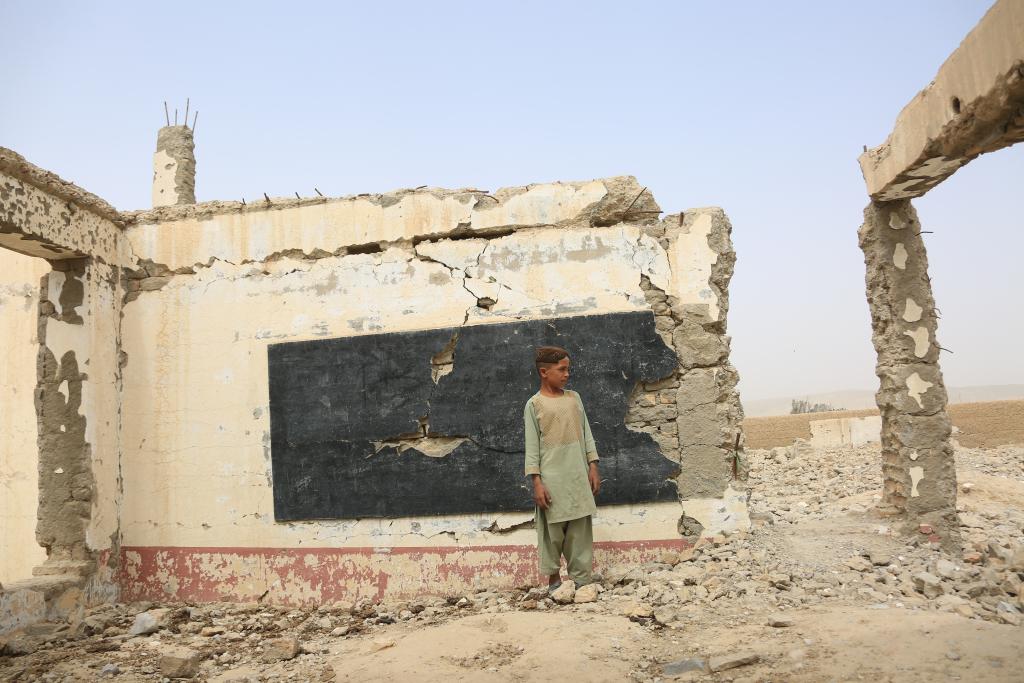 2022年8月23日,在阿富汗南部赫爾曼德省桑金地區(qū),一名男孩站在廢墟之中。桑金地區(qū)曾經(jīng)最繁華的市場,如今遍布美軍空襲留下的一個個巨大彈坑。新華社發(fā)(塞夫拉赫曼·薩菲攝)