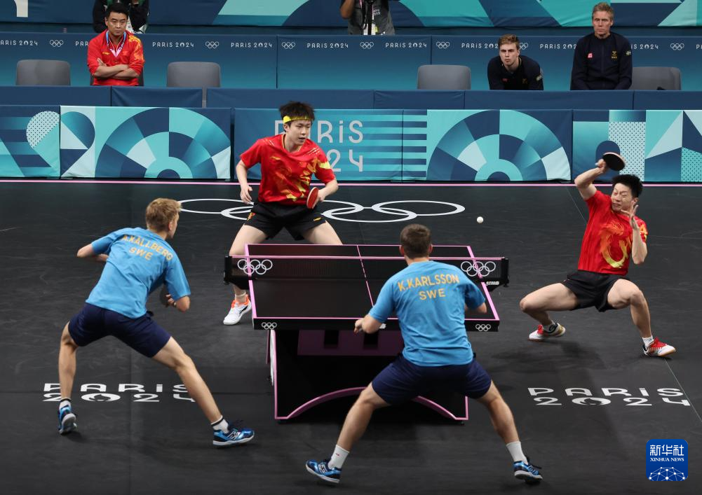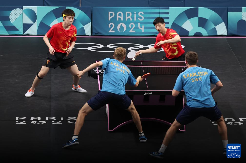 8月9日,中國隊組合馬龍(上右)/王楚欽(上左)和瑞典隊組合科爾貝里/卡爾松(下右)在比賽中。馬龍/王楚欽3比2戰(zhàn)勝科爾貝里/卡爾松。新華社記者 賴向東 攝