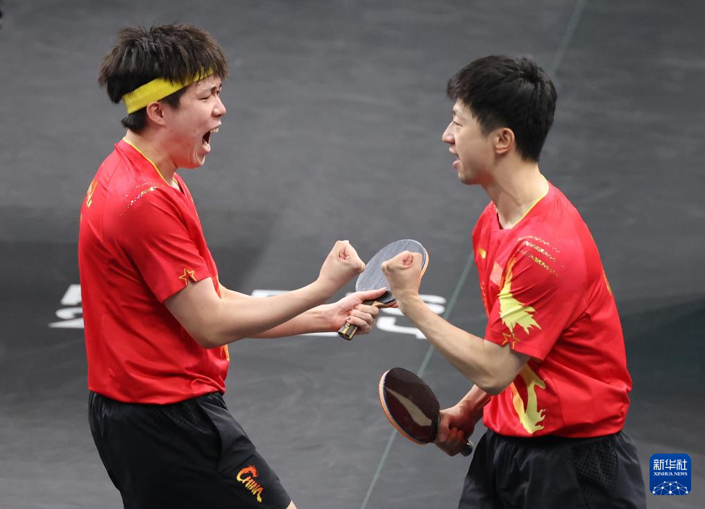 8月9日,中國隊組合馬龍(右)/王楚欽慶祝勝利。新華社記者 盧燁 攝